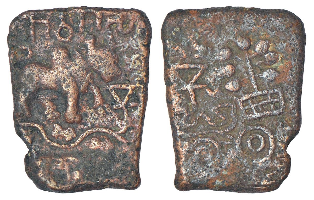 Post-Mauryan South Vidarbha, local monarchical coinage - die-struck copper coin of king Vigra (c. 150-100 BC), 'bull’ type, similar to PAIC 2478, 7.40g. Obv: bull charging to right with tail raised, triangle-headed standard to left; Brahmi legend Raño Vigasa above and river with fishes below. Rev: double-lined Nandipada, surmounted by triangle-headed standard and Swstikas above; a double circle and a tree-in-railing to right.
