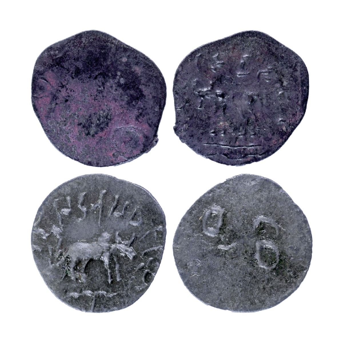 Post-Satavahana, Kadambas of Banvasi, Potin Unit (2), 1.14g & 0.90g, Obv: Humped bull standing on platform facing to right side and around crude Brahmi legend. Obv: Humped bull walking to left side behind tree symbol and around crude Brahmi legend. (K. Ganesh, 4.93).Very Fine+, Rare
