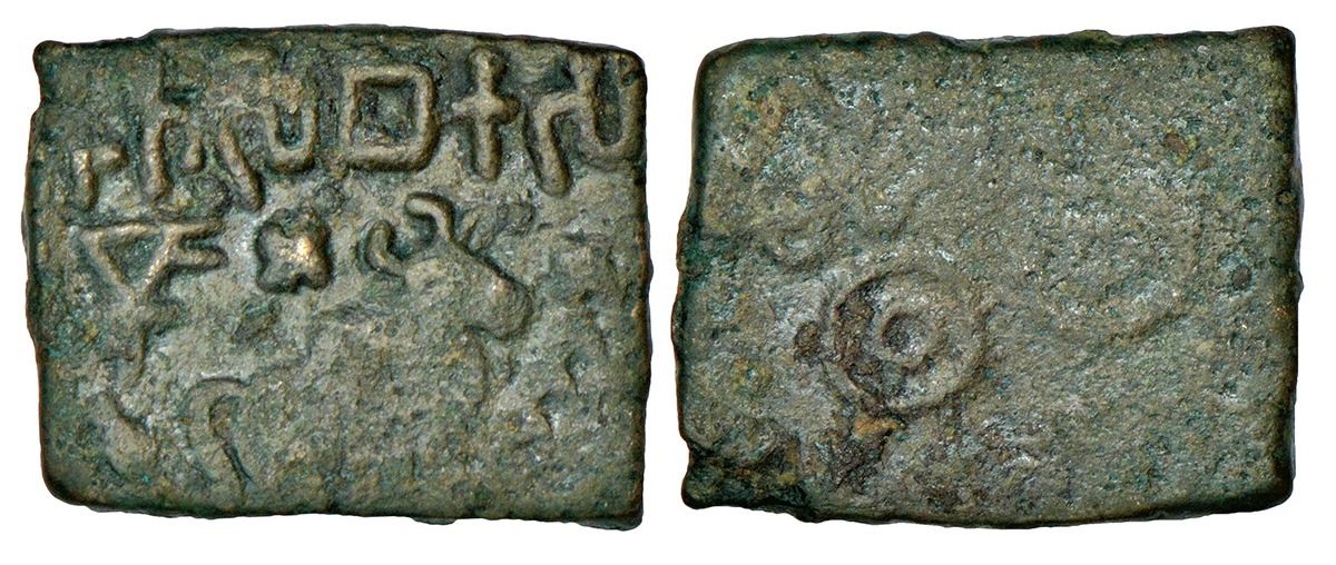 Satavahana, North-Central Deccan region, 'Bull' type copper coin attributed to 'Sebaka', 7.11g. Obv: Bull walking to right, triangle-headed standard behind, Swastika above its back, six-arched hill surmounted by a Swastika in front; Brahmi legend Ramño Sebakasa above. Rev: A bold Nandipada, drawn with double lines with a small taurine between its prongs; a double circle topped by a Shrivatsa to its left.