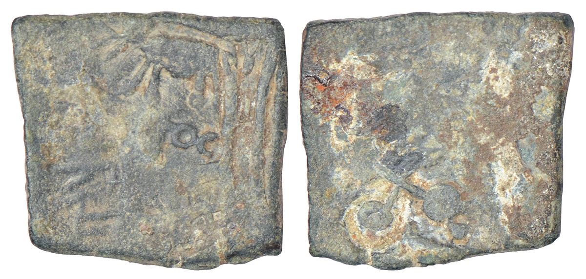 Satavahanas - Siri Sati (c.100-50 BC), inscribed copper punch-marked coin from Vidisha region, PAIC 919, 3.77g. Obv: five punches - 1. 'Ujjain' symbol with modified orb, 2. River with fishes, 3. Elephant facing right, 4. Triangle-headed standard in railing, 5. Brahmi legend …(Siri) Satisa. Rev: single punch of modified 'Ujjain'-symbol with solid orbs.