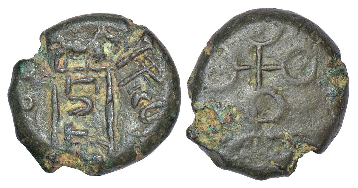 Satavahanas, alloyed copper coin of Naganika and Siri Satakani (c.100-50 BC), MCSI 141, 7.83g. Obv: Brahmi legend Naganika… inscribed vertically on a pillar surmounted by a horse; Brahmi legend Raño Si(ri)… to right. Rev: 'Ujjain’ symbol with Swastikas in each orb within a rectangular border.