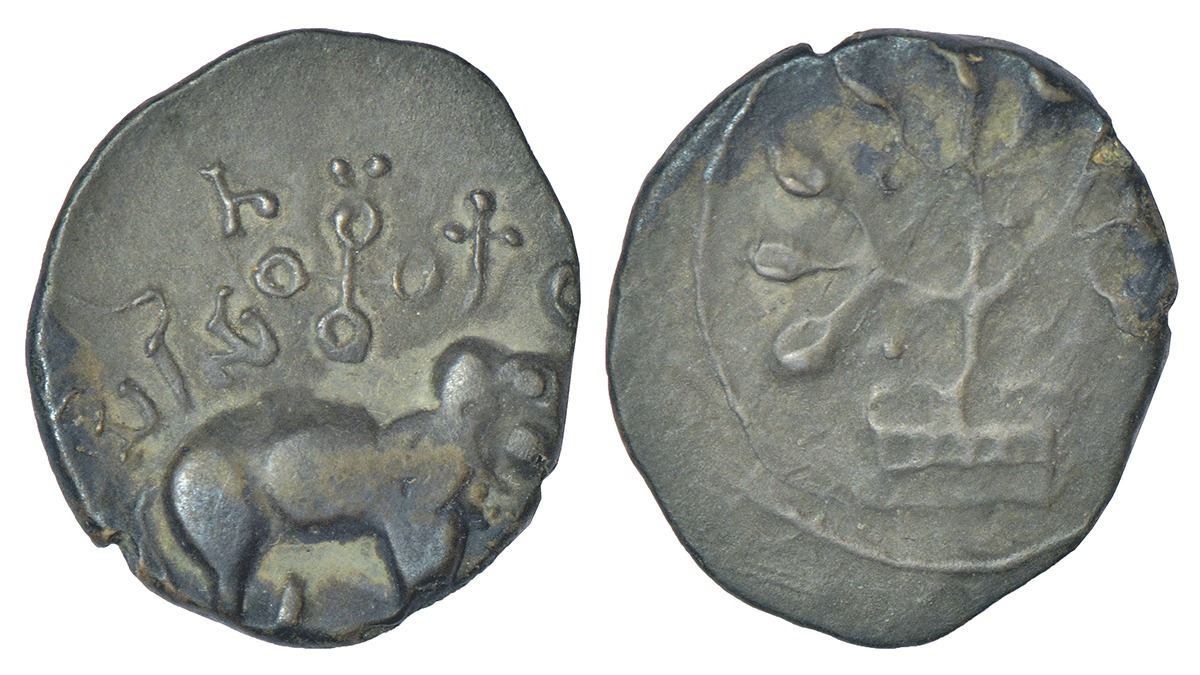 Satavahanas - arsenical copper 'elephant' type coin attributed to Gotamiputa Siri Satakani (c.50-80 AD) from Nasik region, 3.65g. Obv: Elephant marching to right, modified 'Ujjain' symbol above with Brahmi legend …Siri Sataka…Rev: tree with hollow leaves in a railing, with dots placed between branches.