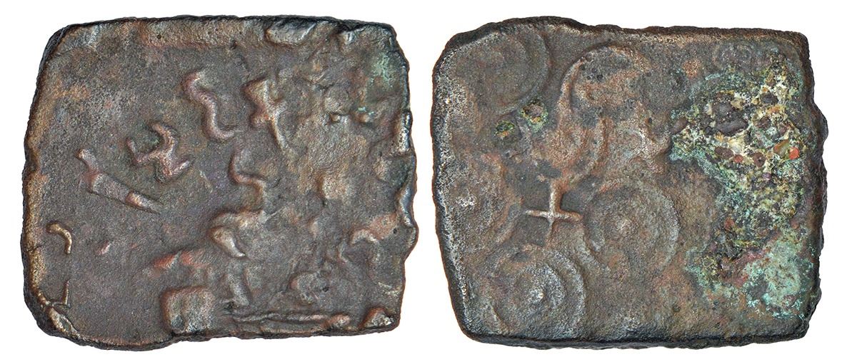 Satavahanas, copper coin attributed to Siri Satakani (100-50 BC), 'Obverse - Obverse / Reverse - Reverse' counterstrike, 5.82g. Obv: Elephant with Shrivatsa under its mouth; Undertype: Parts of elephant, tree - in - railing and legend …Siri Sada…visible. Overtype: …Siri Sadakamnisa. Rev: Two 'Ujjain' symbols superimposed.