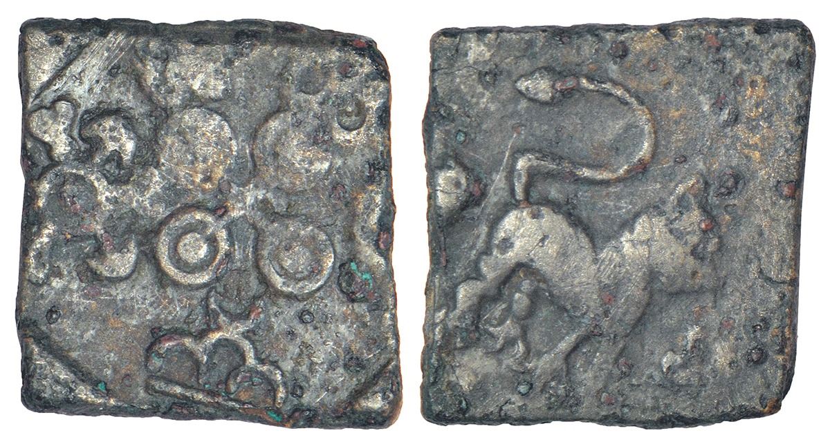 Satavahanas - uninscribed fractional 'lion' type coin from Vidarbha region, attributable to Siri Satakani/Siri Sati (c.100-50BC), not listed in PAIC, 4.34g. Obv: 'Ujjain' symbol with one orb modified as Nandipada in centre, other symbols (Shrivatsa, six-armed symbol, three-arched hill with crescent) around. Rev: lion standing, facing right, with raised tail.