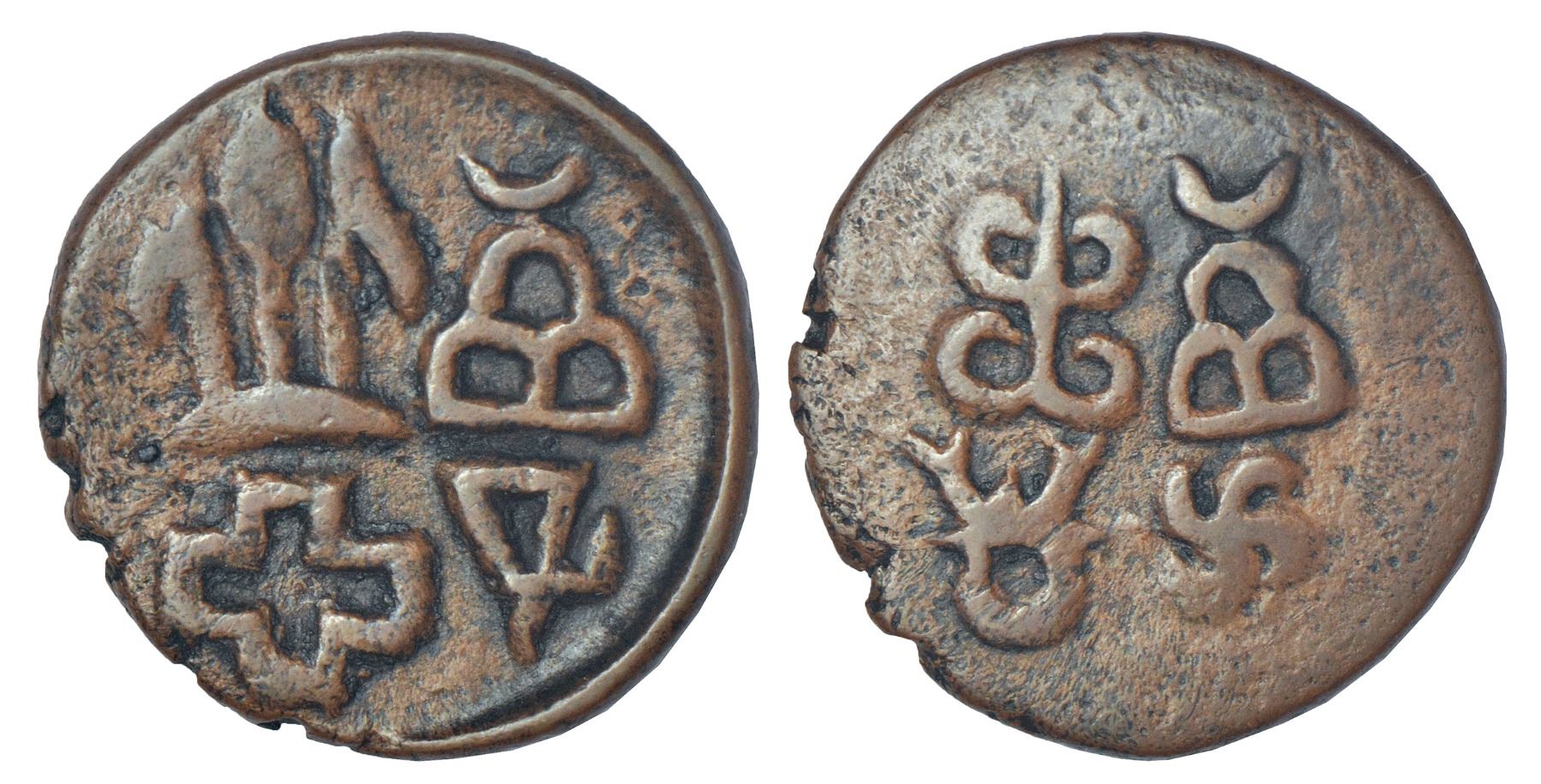 Taxila - uninscribed copper die-struck local coinage of post-Mauryan period, (c.200-150 BC), biface series, 'symbolic’ type, PAIC 1513, 7.05g. Obv: Symbolic configuration - clockwise from top left, a spear/standard with ribbons, three-arched hill with crescent, triangle-headed standard, open cross. Rev: Symbolic configuration - clockwise from top left, Shrivatsa, three-arched hill with crescent, Swastika, Nandipada.