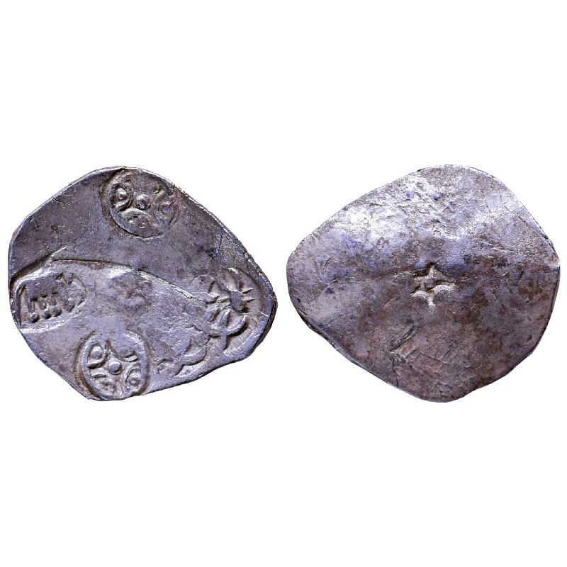 Vatsa Janapada (c. 500-400BC), Archaic Punch Marked Coinage, Kaushambi Area (Allahabad Region), Silver Karshapana, 3.35gms, ABCC configuration, Obv: Royal symbol of scorpion with fish, elephangt and twice symbol of four crescent within circle, Rev: Banker mark. (Rajgor, Series 78).Very Fine+, Rare