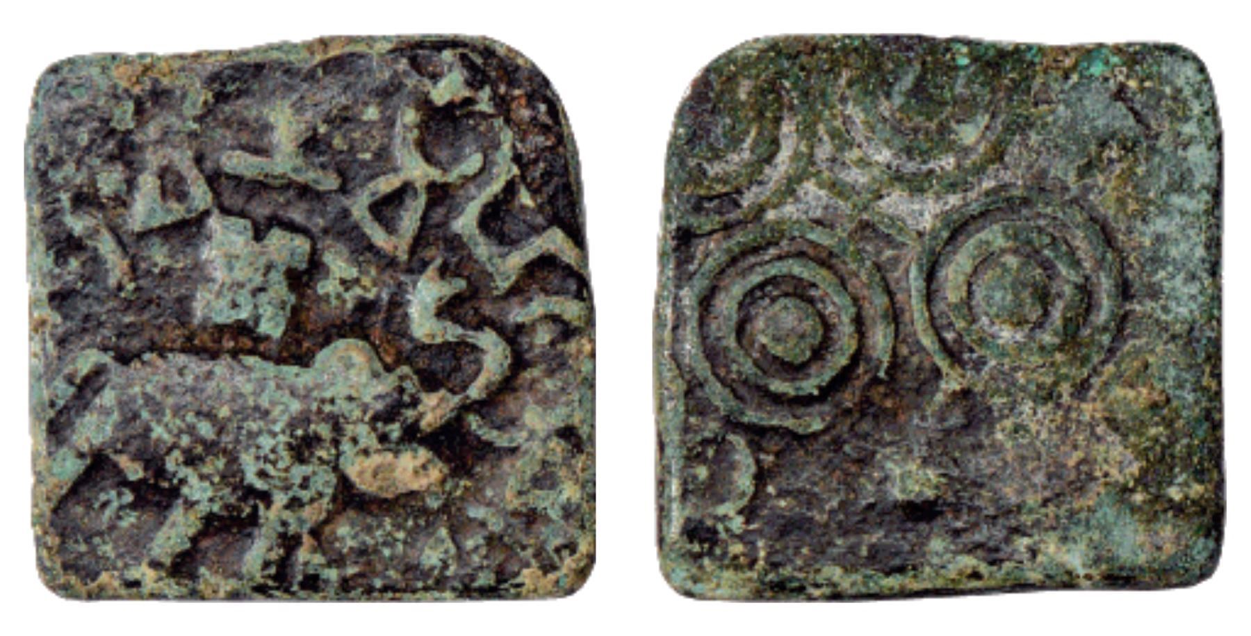 Ancient, copper coin attributed to 'Mahagamika' of the Sangama family, 3.31g. Obv: Elephant with upraised trunk marching to right, Swastika on its back; brahmi legend …mana Maha(ga)… above. Rev: 'Ujjain' symbol with concentric orbs, one of them modified as a Nandipada; Swastikas within all quadrants.