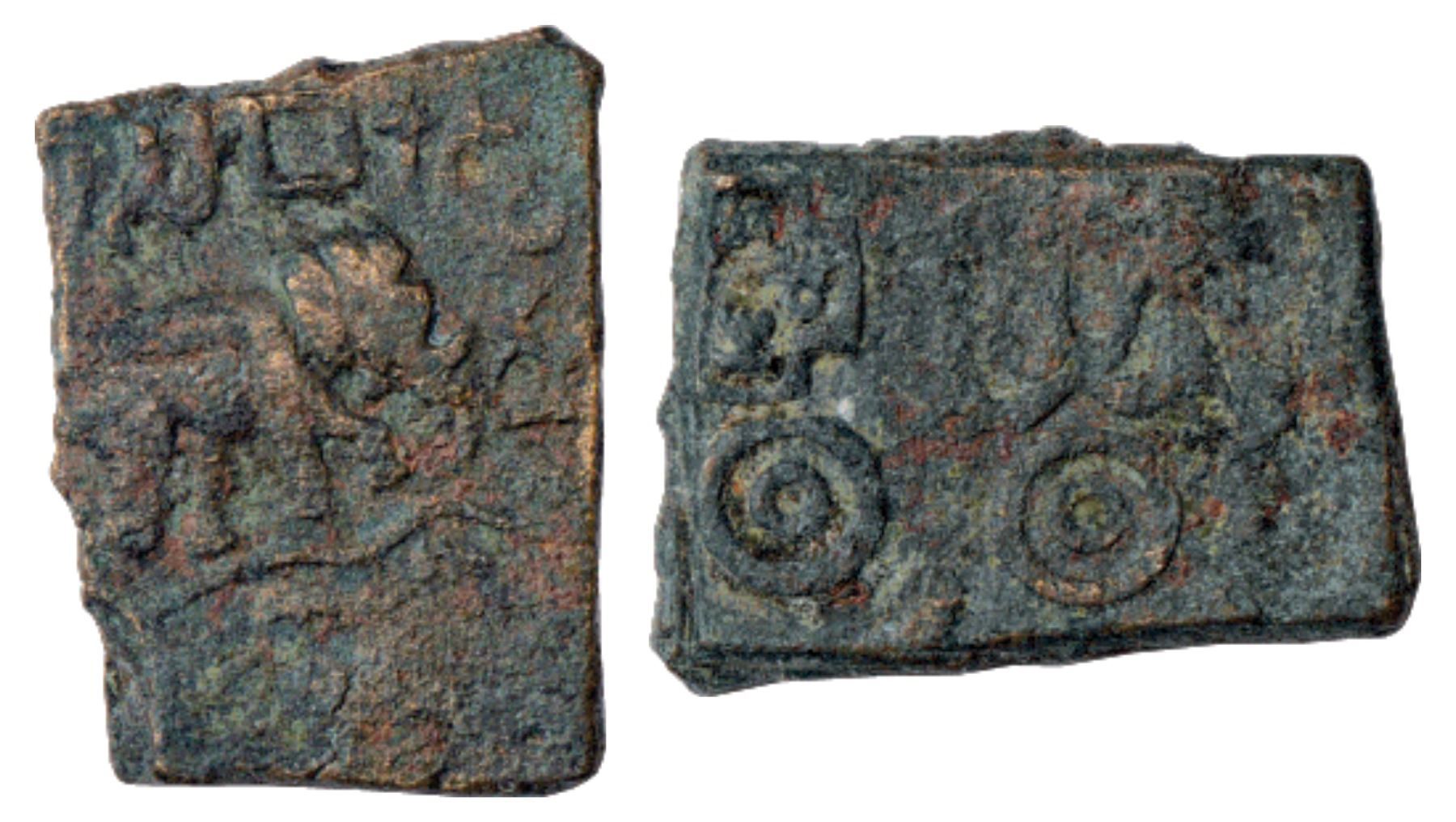 Ancient, copper coin attributed to 'Sebaka', Elephant type, 9.01g. Obv: Elephant walking to right, wavy line with fishes below, three-arched hill with crescent to right; brahmi legend …Sebakasa above. Rev: Bold Nandipada drawn with double lines, a circle to its left and an open cross with Nandipadas and Shrivatsas inside above the circle.