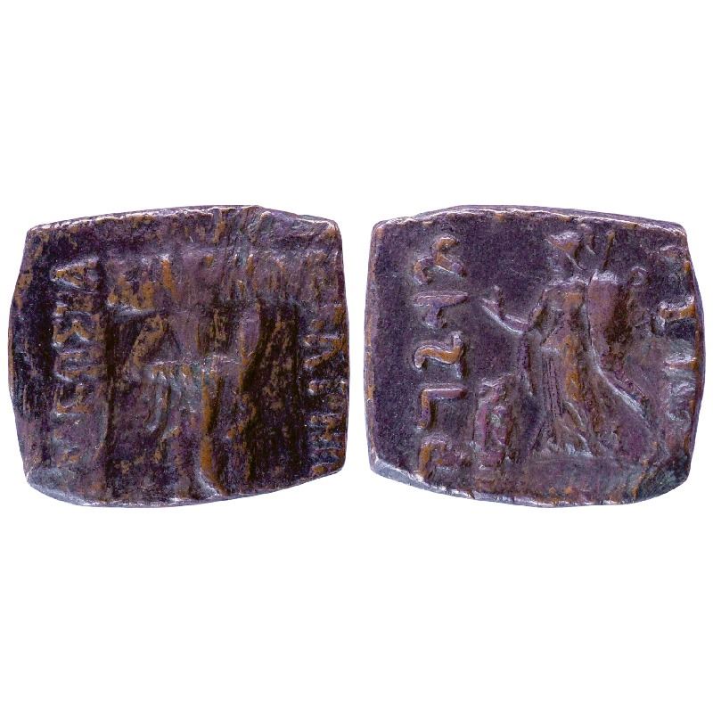 Indo-Scythians, Vonones with Spalagadames (c. 100-65 BC), Copper Drachma, 7.66gms, Obv: Naked herakles standing facing to left side, crowning himself and holding club, with Greek legend around, Rev: Athena standing to left side holding spear and shield in one hand and raising the other hand, monogram on left side, with Kharoshthi legend around. (Bop & Pieper, 242).Very Fine+, Rare.