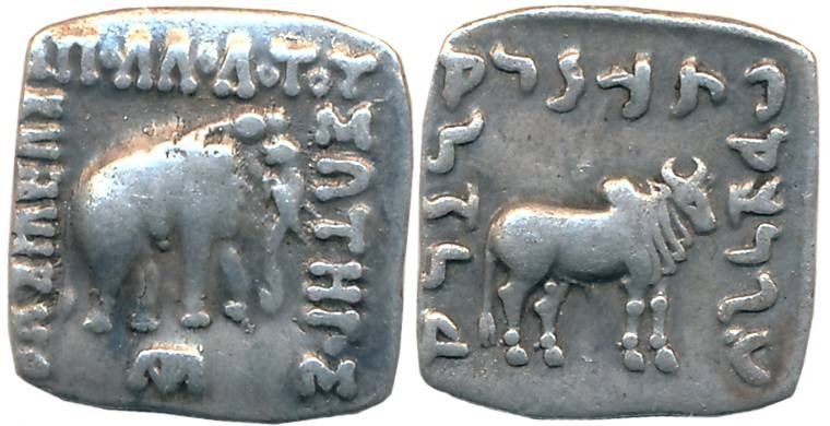 Indo Greeks, Apollodotos I, Silver Square Drachma, 2.31g, Obv: Elephant to right Greek legend “BASILEOS APPOLLOTOTOY SOTER ”around, Rev: Humped Bull to right Kharoshthi legend “Maharajasa Apaladatasa Tratarasa” around (Pieper# 1151). Very fine.