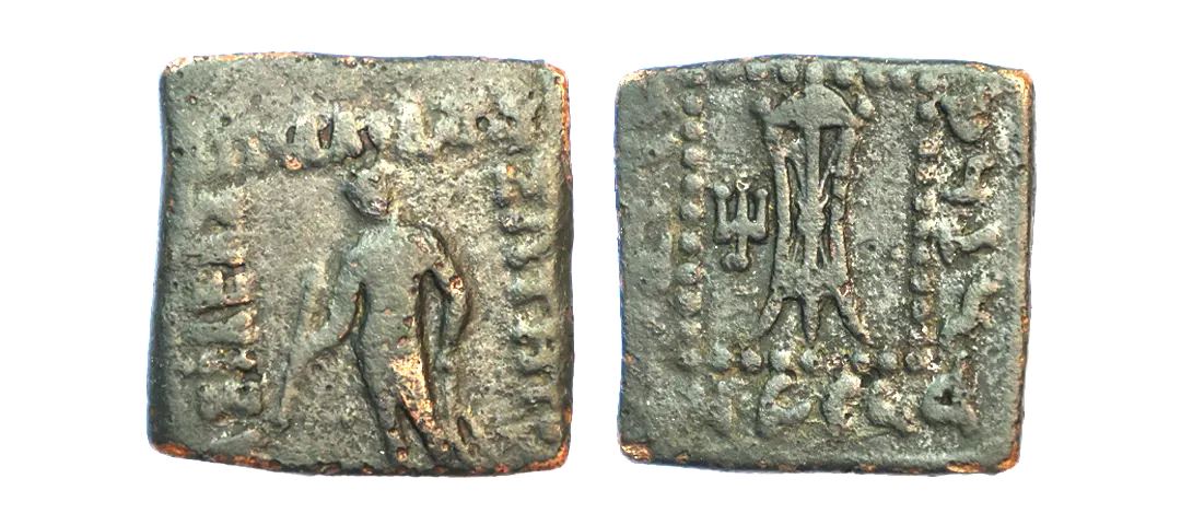 Ancient, Indo-Greeks, Apollodotus II (80-65 BC), Copper Quadruple, 9.37 gms, Obv. Apollo radiate, standing facing, holding arrow in right hand and bow in left arm, Greek legends around, Rev. Tripod withing dotted border, monogram at left, Kharoshthi legend around Bop#6g, about very fine, scarce.