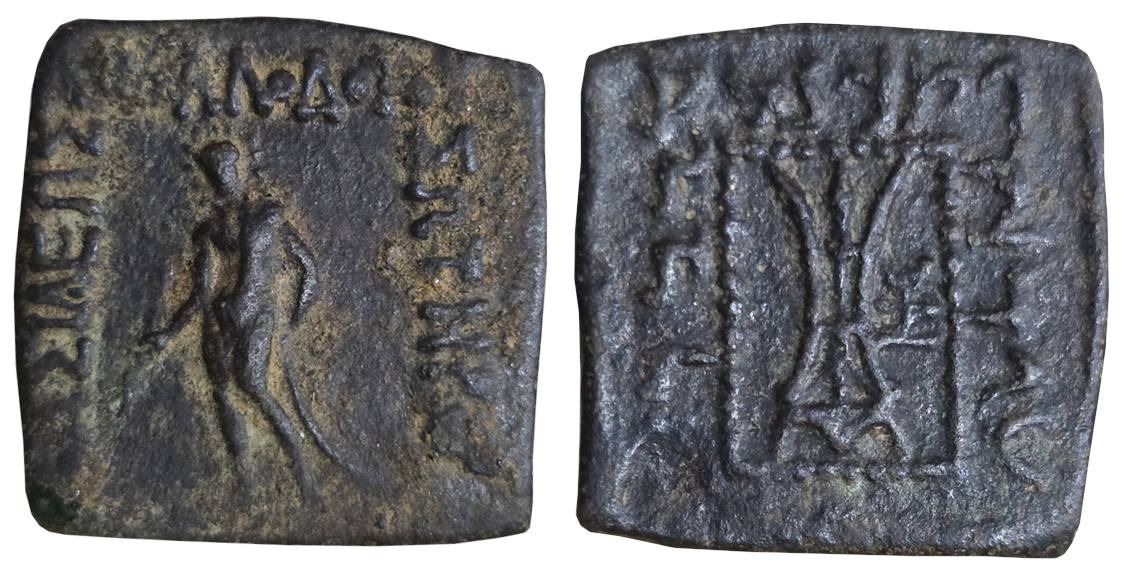 Indo Greeks, Apollodotos I, Bronze, 9.35g, Obv: Apollodotos standing holding bow and arrow, Greek legend "BASILEOS APOLLODOTOY SOTEROS" around, Rev: Tripod of Apollo in dotted border, monogram at right, Kharosthi legend "Maharajasa Apaladatasa Tratarasa" around (Hoover# 120). Patinated, extremely fine, rare in this grade.