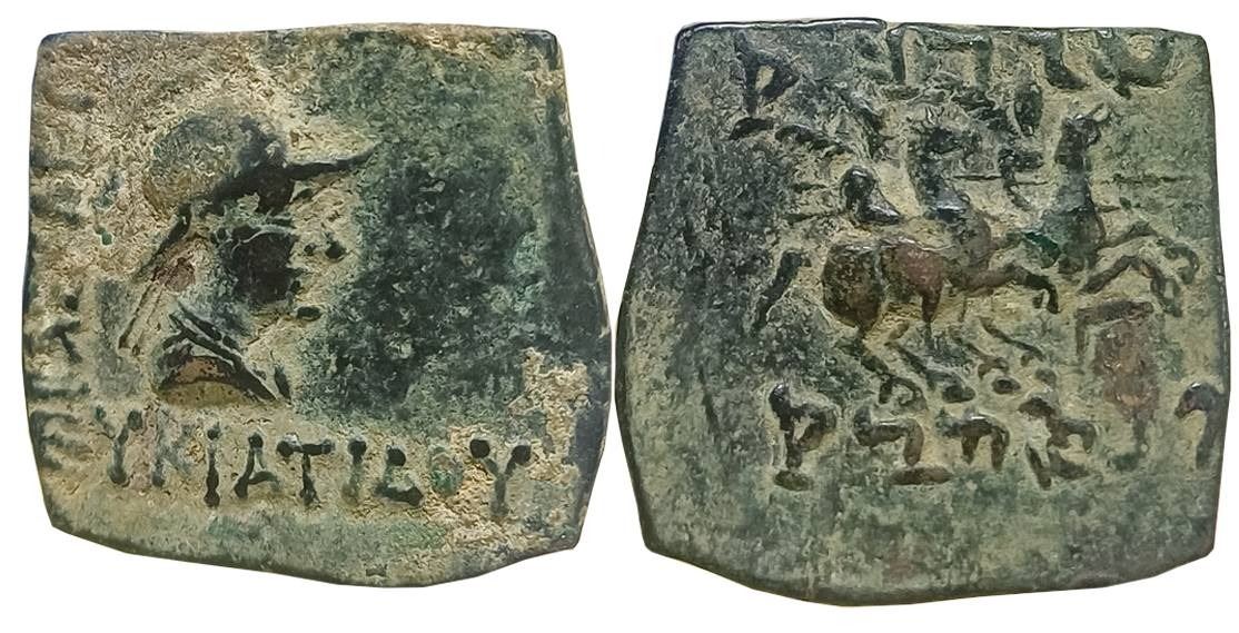 Indo Greeks, Eukratides I, Copper, 8.08g, Obv: Helmeted bust of king facing right, Greek legend “BACILEOC MEGALOU EUKRATIDOU” around, Rev: Dioskuroides on horseback, Kharosthi legend above and below (Hoover# 146). Patinated, extremely fine+, rare.