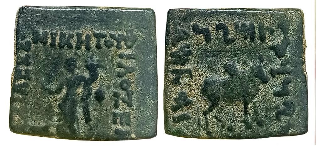 Indo Greeks, Philoxenos, Copper, 7.75g, Obv: Tyche standing holding cornucopia, Greek legend “BASILEOS ANIKETOU PHILOKZENOU”, Rev: Bull walking to right, Kharosthi legend “Maharajasa Apatihatasa Philasinasa” (Hoover# 274). About extremely fine, rare.