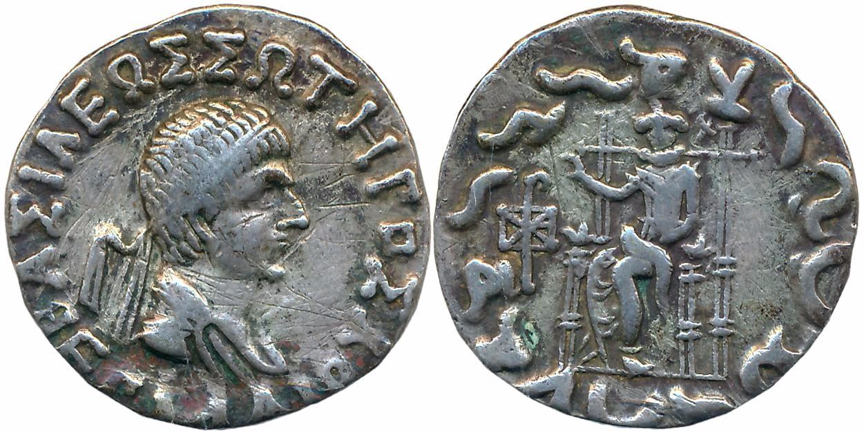Indo Scythians, Hermaios, Silver Tetradrachm, 9.45g, Obv: Diademed bust of Hermaios to right, Greek legend "BACILEOC SOTEROS HRMAIOY" around, Rev: Zeus enthroned facing, making benediction gesture, holding scepter, monogram to left, Kharosthi legend "Maharajasa tatarasa heramayasa" (Hoover# 300). Minor scratches on obverse otherwise very fine, rare.