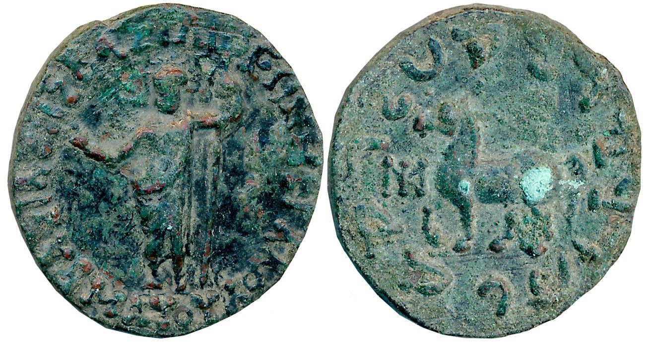 Indo Scythians, Maues, Bronze, 10.34g, Obv: Zeus standing facing, making benediction gesture and holding scepter, Greek legend “BASILEOS MAUOU” around, Rev: Horse walking to left, monogram to left, Kharosthi legend “Rajadirajasa Mahatasa Moasa” around (Hoover# 535). Extremely fine for type, extremely rare.