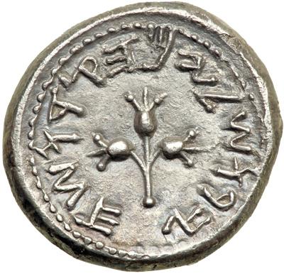 Ancient Judaea. The Jewish War, 66-70 CE. AR Shekel (13.54 g) dated year 2 (67/8 CE). Temple vessel with rim decorated with nine pearls; above, date. Reverse: Stem with three pomegranate fruits. Mesh 151; AJC II, 260, 8; H. 659. Large flan. A beautiful shekel. Extremely Fine.