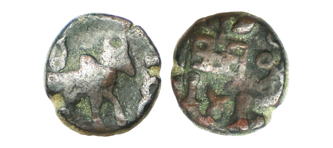 Ancient, Kaushambi, Vatsa Region (2nd-1st Century BC), Varunamitra, Copper Unit, 0.87 gms, Obv. Bull to right, Rev. Tree in Railing, Brahmi legend below reading as ‘(Varu)NaMiTa(sa)’, Pieper # 1168, fine to very fine, very rare.