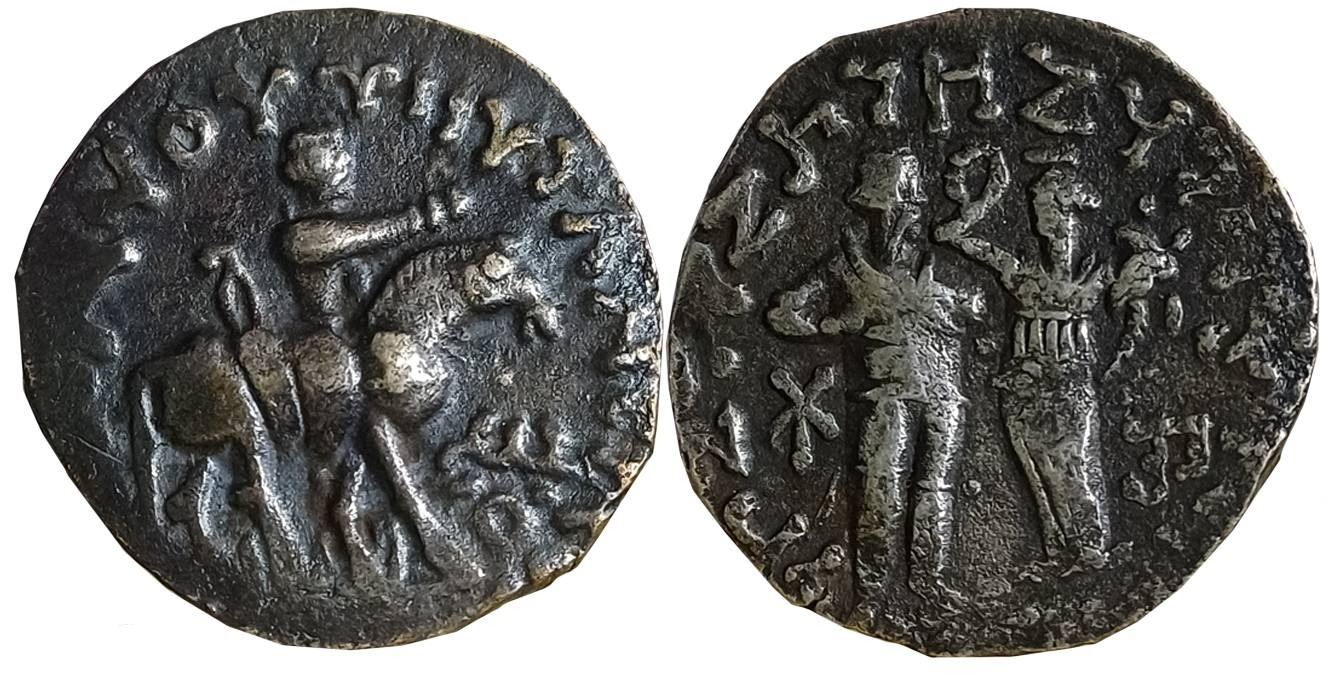 Kshatrapas of Kashmir (Chuksa), Zeionises as Kshatrap, Silver Tetradrachm, 9.88g, Obv: Scythian king advancing to right on horseback, holding Elephant goad, Nandipada to left, monogram to right, Bactrian legend around, Rev: Scythian king standing right, crowned by Tyche standing to left holding wreath & cornucopia. Monogram to left, Kharosthi legend “Manigulasaputrasa chatrapasa Jihuniasa” around (Hoover# 722). Extremely fine for type, extremely rare.