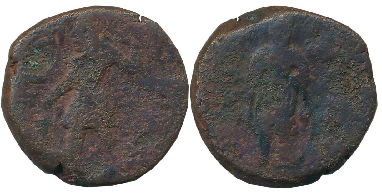 Kushans, Kanishka, Copper Tetradrachm, 16.21g, “Sakhamana Boddo”, “Transparent Garment” type, Purushpura-Taxila Mint, Obv: King standing, offering to fire altar, Rev: Lord Buddha standing in Abhay Mudra, Transparent garment (Gobl #786) seen. Very fine for type, very rare.