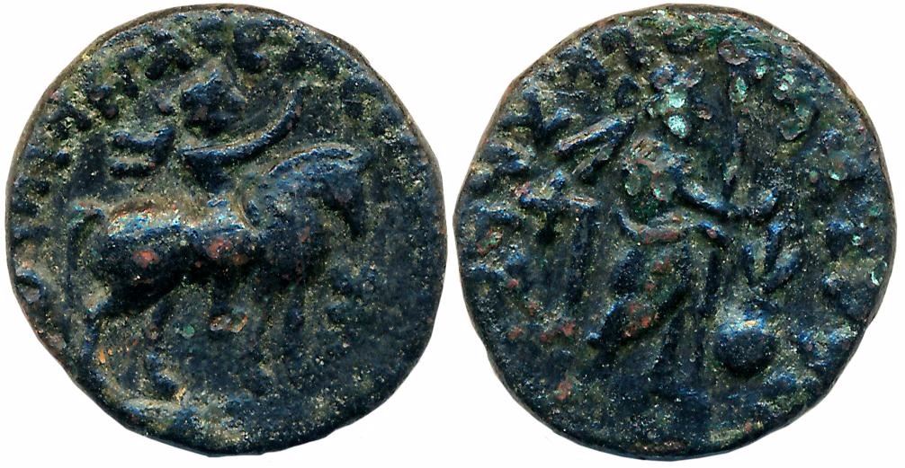 Kushans, Vima Takhto as Soter Megas, Billon Tetradrachm, Taxila series, 9.56g, Obv: King mounted on horse holding a whip, cursive Greek legend around, Rev: Zeus standing, vase with trident to right and Kharosthi letter ‘Vi’ to left, Kharosthi legend "Maharajasa Rajatirajasa Mahatasa Tratarasa" partly visible around (MAC# 2915-2917). Very fine.