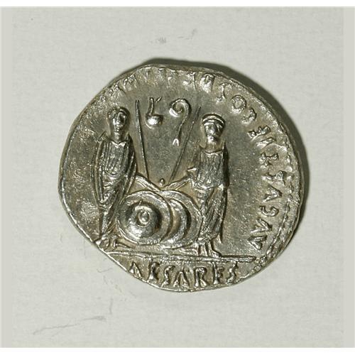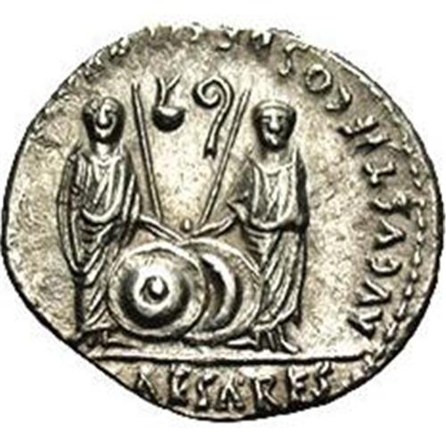 <B>Augustus.</B></I> 27 B.C.-A.D. 14. AR denarius (19 mm, 3.79 g). Lugdunum, ca. 2 B.C.-A.D. 4. Laureate head right / Gaius and Lucius standing facing, holding spears and resting hands on shields set between them; simpulum and lituus between. RIC 207; BMC 519; RSC 43. Good VF, light porosity. <BR><BR><b>Shipping:</b> Coins & Currency (<a target="_blank" href="http://www.heritageauctions.com/common/shipping.php">view shipping information</a>)