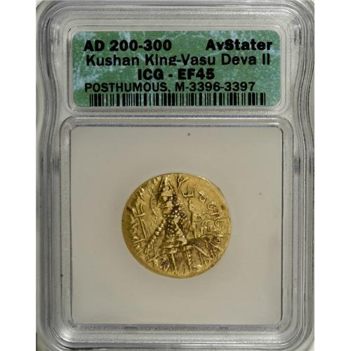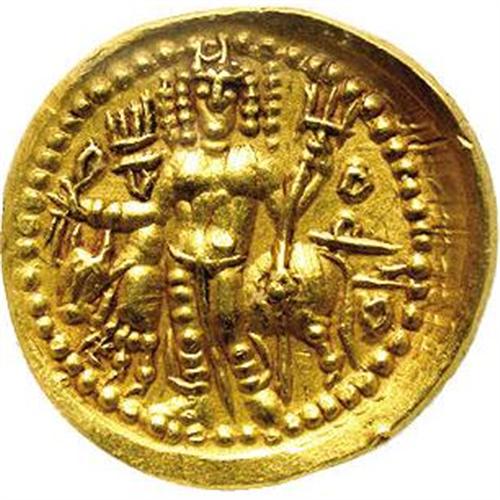 <B>India, Kushan Empire. Xodeshah.</B></I> Ca. mid-3rd century A.D. AV dinar (24 mm). King standing left, sacrificing at altar, holding trident; trident standard behind, star and tamgha in right field / Siva standing facing, holding trident and diadem, the bull Nandi standing left behind; tamgha in upper left field. Gobl 662 (same dies as pl. 55, I-1/2). XF45 ICG (incorrectly attributed to Vasudeva II). <BR><BR><b>Shipping:</b> Coins & Currency (<a target="_blank" href="http://www.heritageauctions.com/common/shipping.php">view shipping information</a>)