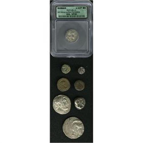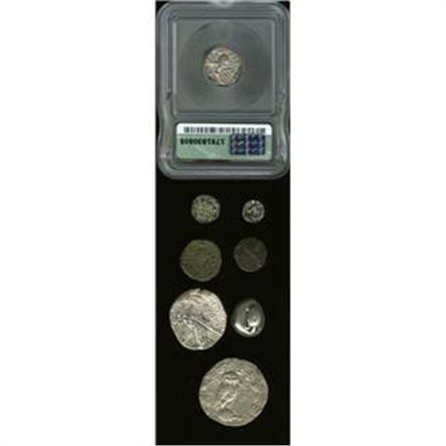 <B>Lot of eight miscellaneous ancient coins.</B></I> Includes: Attica, Athens. AR tetradrachm. New Style // Aigina. AR stater. Early T-back issue // Ionia, Ephesos. AR diobol // Phoenicia, Tyre. AR shekel // Miscellaneous Judaean bronzes (2) // Roman Egypt. Maximianus. Potin tetradrachm // Sex. Pompeius. AR denarius. Average Fine to VF, the large silver corroded, the Republican denarius encapsulated, VF30 ICG. <BR><BR><b>Shipping:</b> Coins & Currency (<a target="_blank" href="http://www.heritageauctions.com/common/shipping.php">view shipping information</a>)