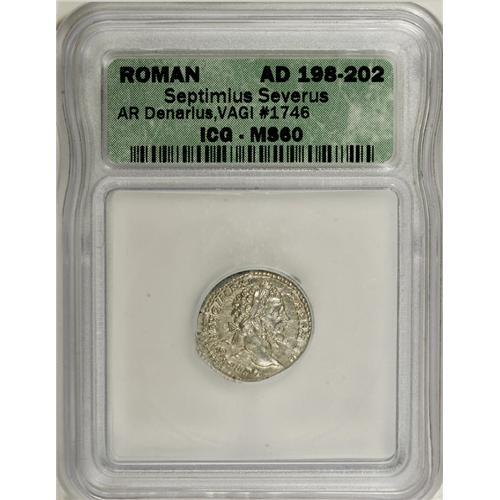 <B>Septimius Severus.</B></I> A.D. 193-211. AR denarius (18 mm). Rome, A.D. 198-200. L Laureate head right / Aequitas standing left, holding scales and cornucopiae. RIC 122c; BMC 122; RSC 21. MS60 ICG. <BR><BR><b>Shipping:</b> Coins & Currency (<a target="_blank" href="http://www.heritageauctions.com/common/shipping.php">view shipping information</a>)