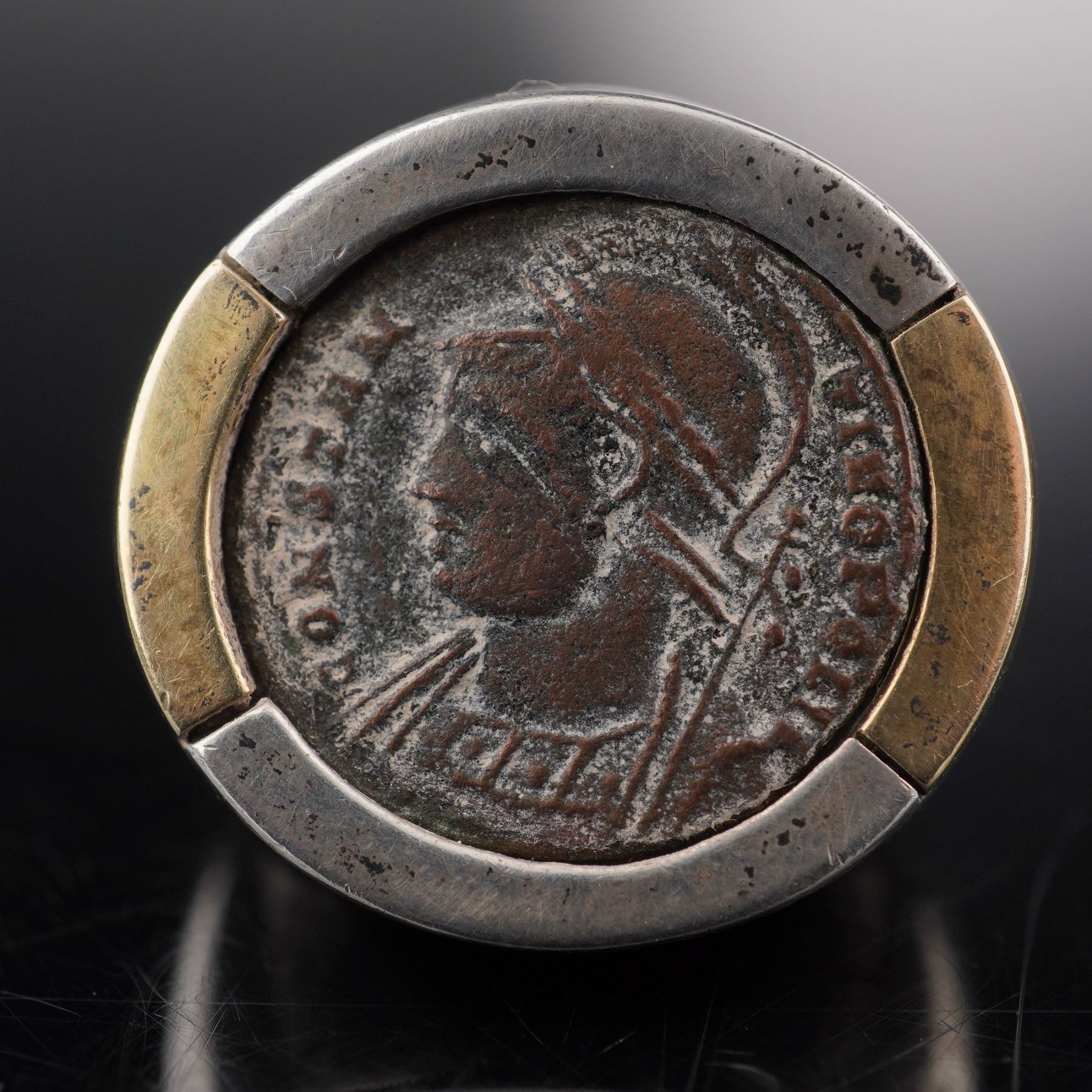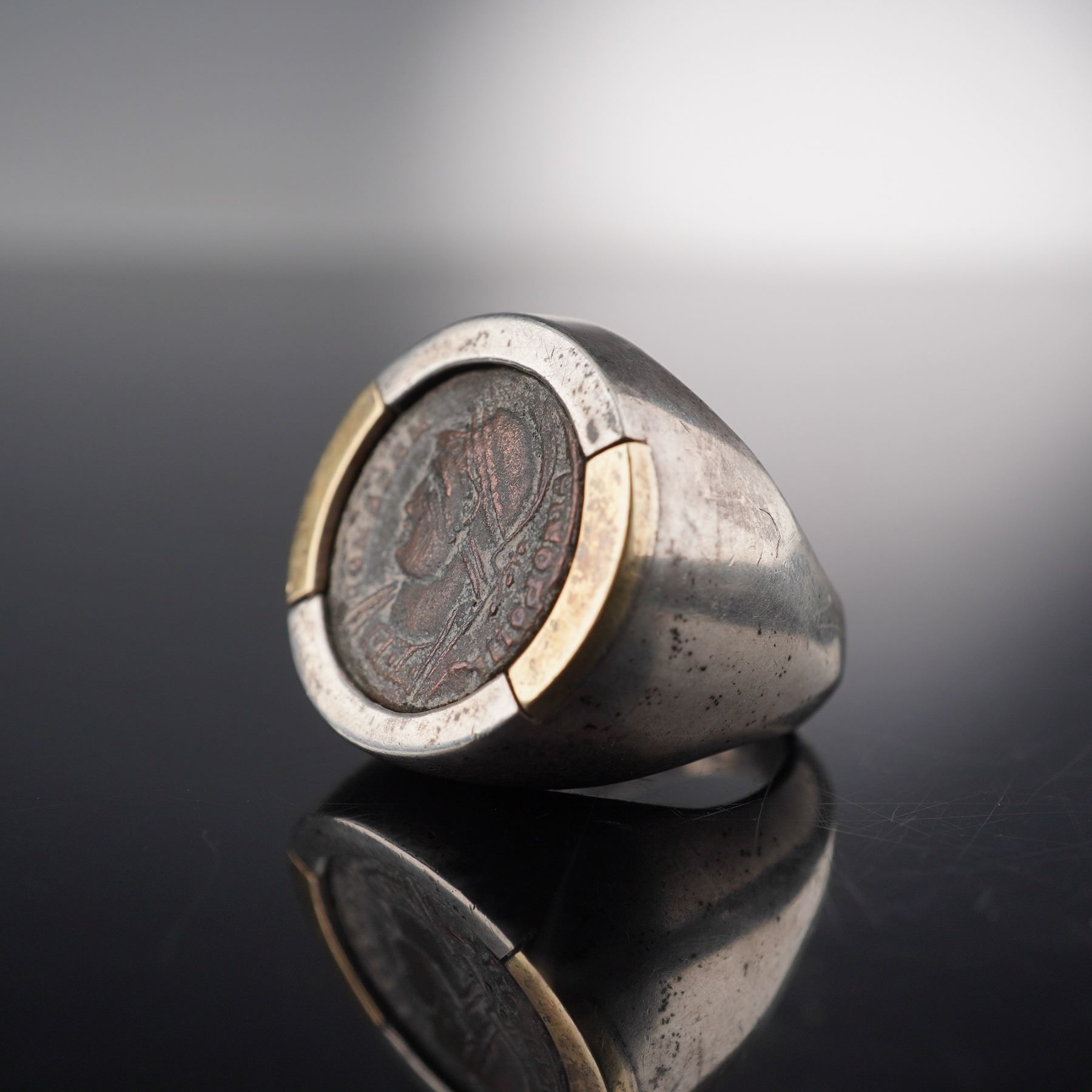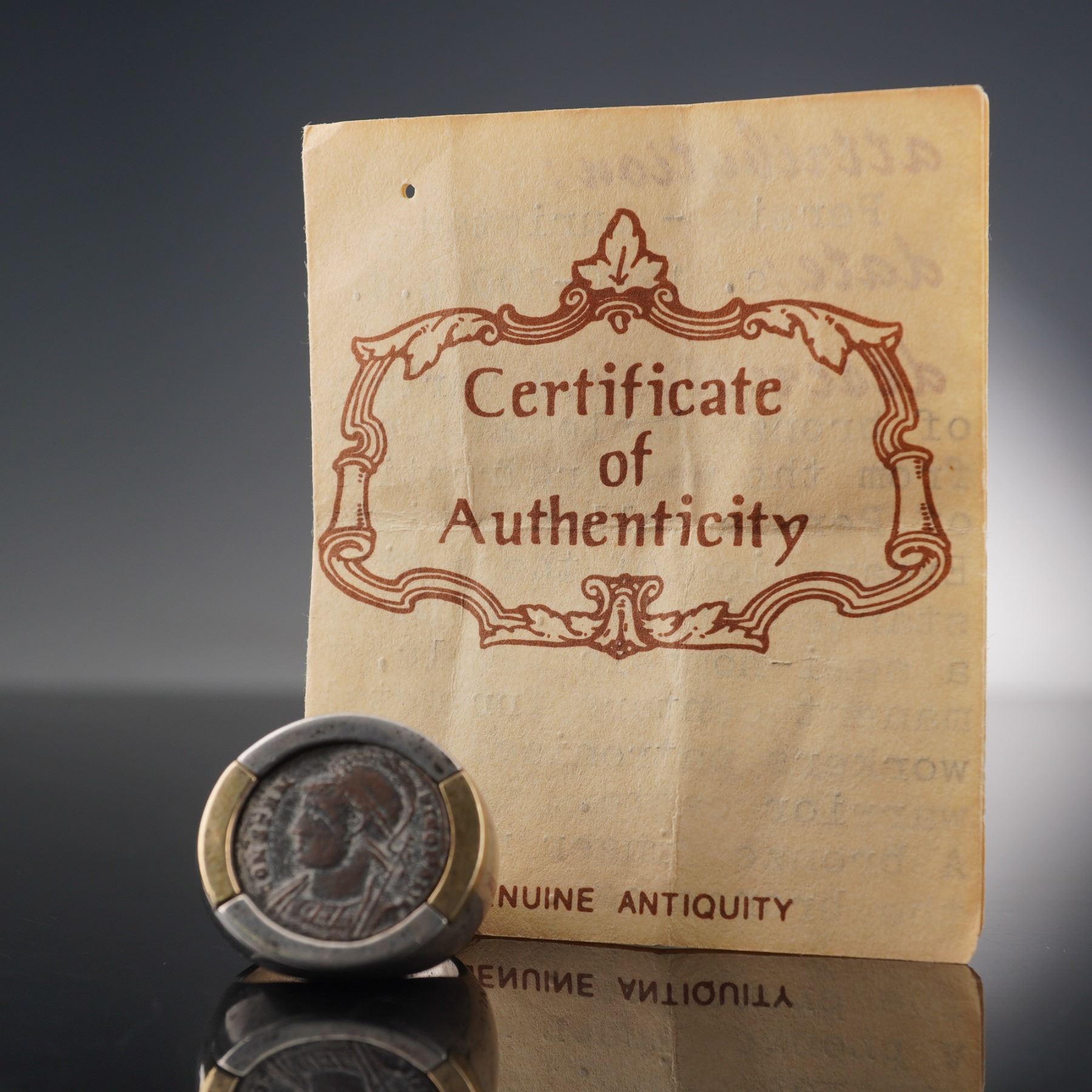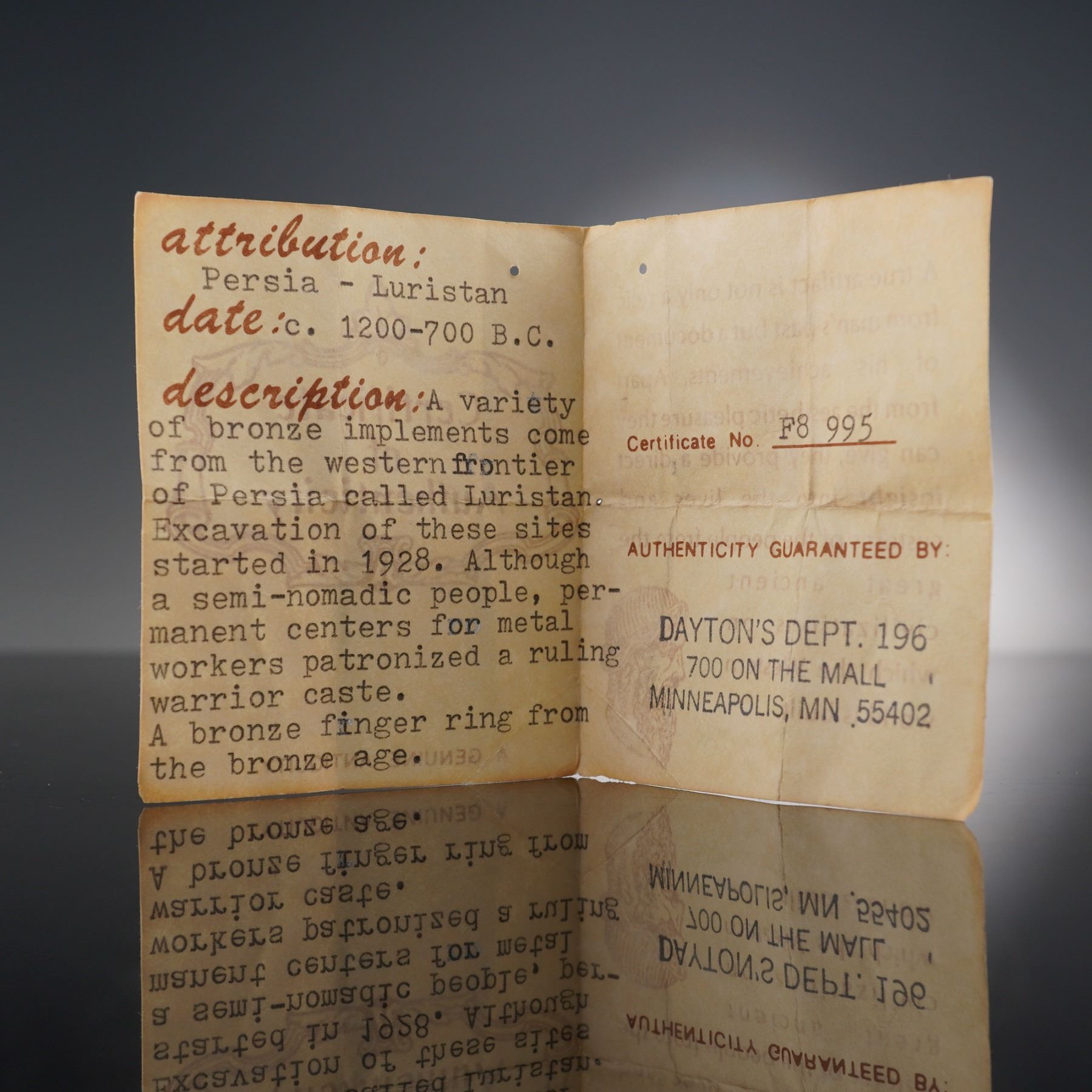 A modern ring set with an ancient bronze artifact from the Luristan region of western Persia. The accompanying certificate of authenticity describes the piece as a bronze finger ring from Luristan, dating approximately 1200-700 B.C., using the term to refer broadly to small bronze ornaments and fittings excavated from the area. These artifacts reflect the skill of Luristan metalworkers who crafted decorative and functional objects for a warrior society. The ancient bronze element is now mounted in silver-toned metal ring with gold-toned accents. While the mount is of later origin, the inset bronze component represents an artifact from the Bronze Age, combining early Persian craftsmanship with a modern presentation. Weight: 16 g. Estate of Charles H. McCollister, a world traveler known for his connections with notable figures.