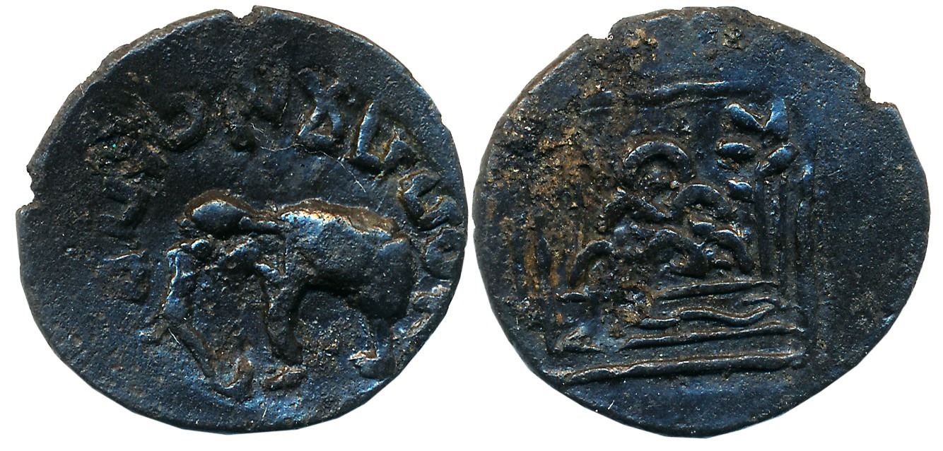 Maharathi, Coastal Andhra Pradesh, Rayalaseema Upper Krishna Valley region, Maharathi Mahahathi, Lead, 4.31g, Obv: Elephant standing on pedestal facing left, Brahmi legend “Maharathisa Mahahathi(sa)” above, Rev: Six-arched hill in centre, wavy line below; sacrificial pillar to left and palm tree to right, all enclosed in a rectangular border (Unpublished in major publications). Pleasant specimen with almost complete details and legend. Extremely fine for type, extremely rare.