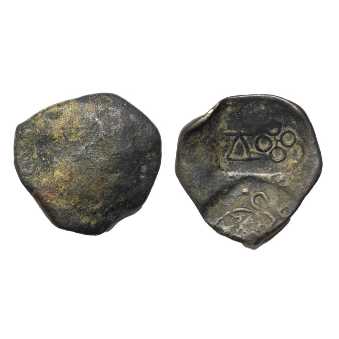 Ancient, Malwa, Kurupurika City State (2nd-1st Century BC), Copper Unit, 5.10 gms, Obverse: countermark punch of Ujjain symbol and Triangle standard, slight traces of an under type, Reverse: uniface, Pieper # 823, very fine, rare.