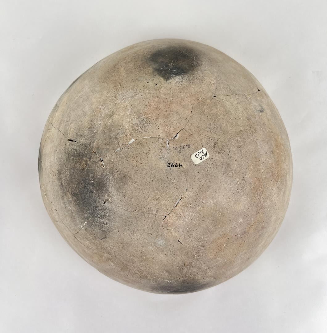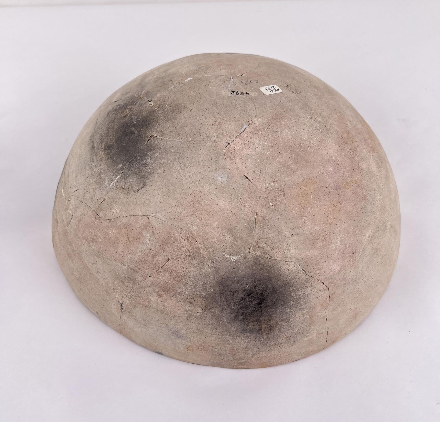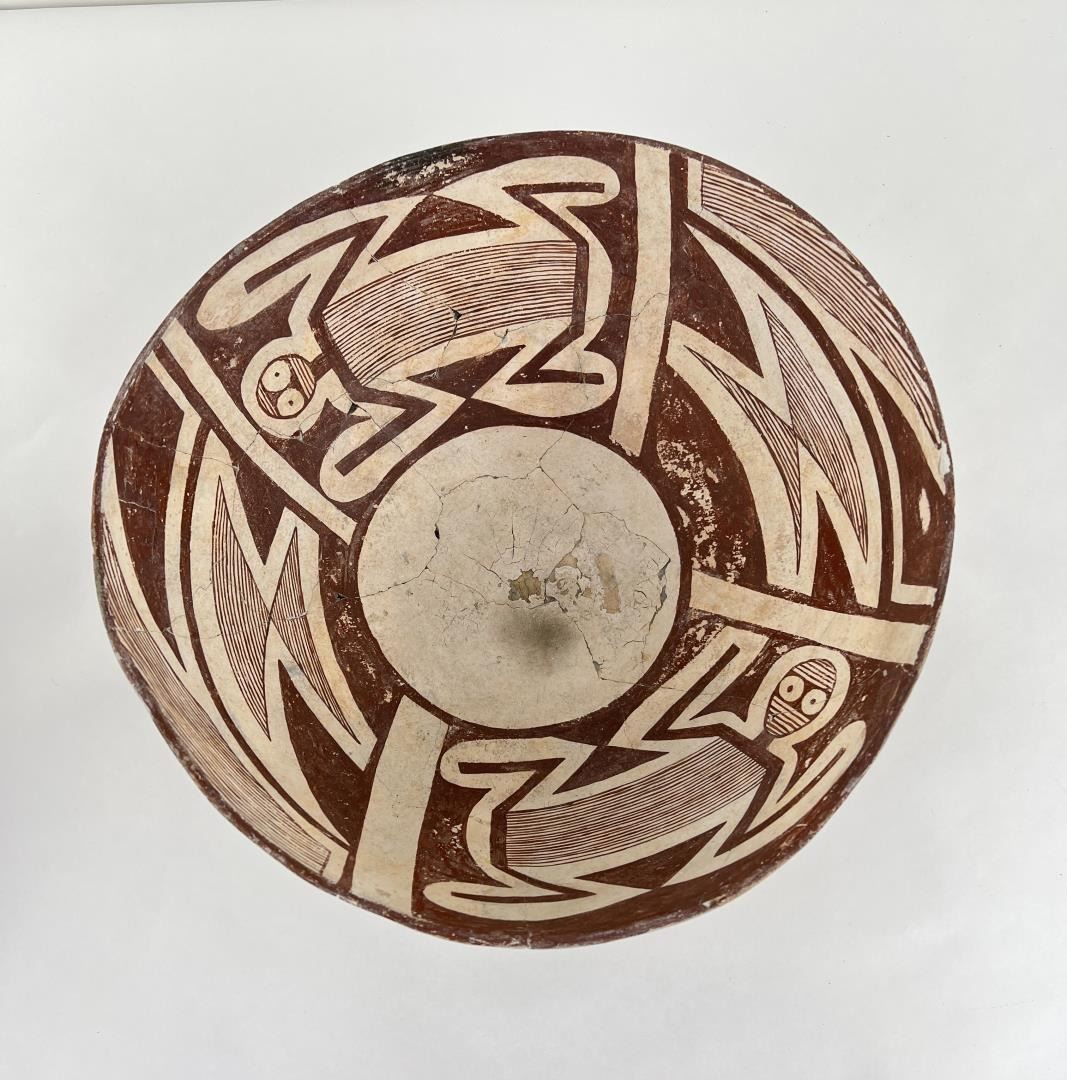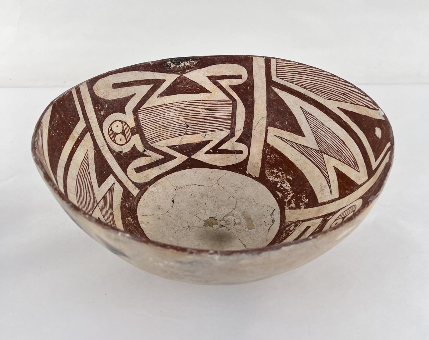 Amazing, reddish/brown-on-white bowl with opposed humanoid figures, both with hachured bodies, plus other bold, geometric symbols. Very good condition, kill hole filled in, and with some professional restoration. From a very old and famous collection, legally collected on private land. 12" diameter, 4 7/8" tall. Allard Auction Collection Inv: AX