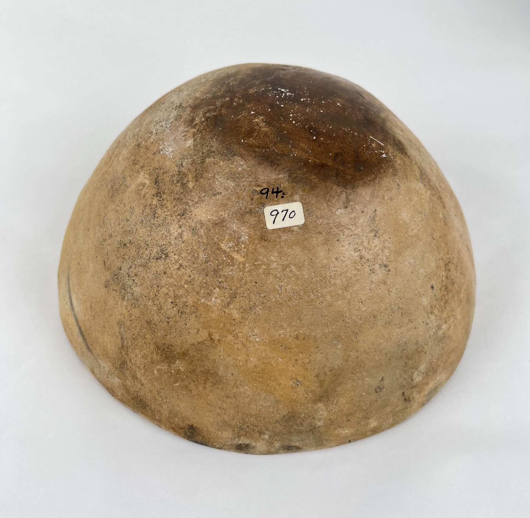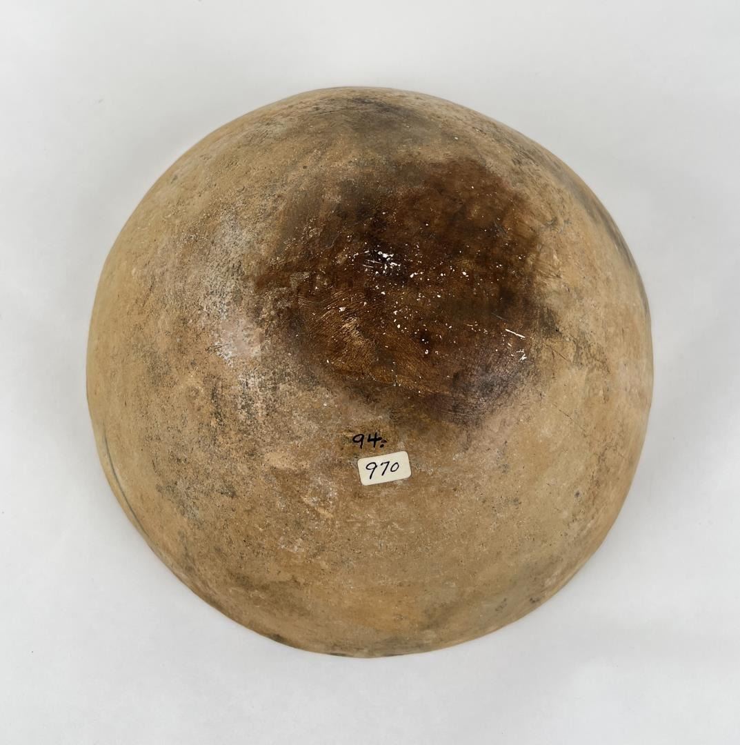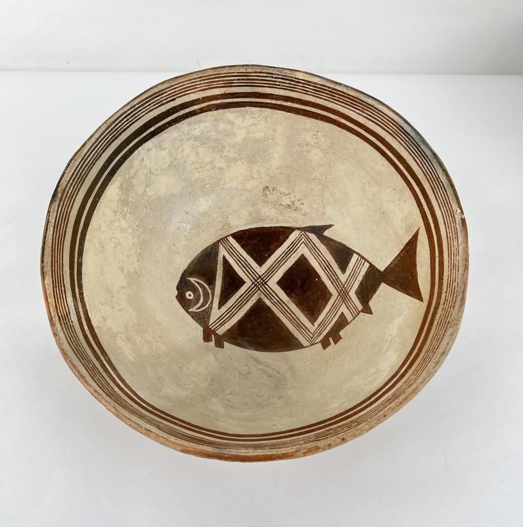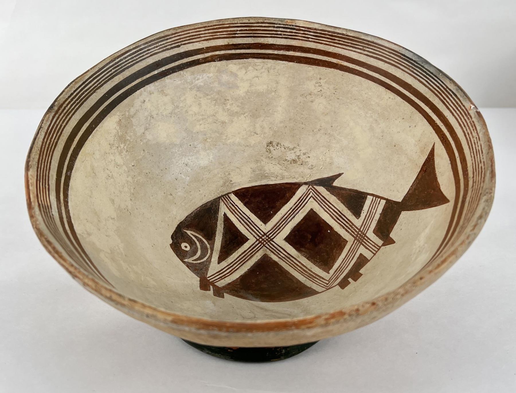 Rare stylized fish with crisscrossed bands on the body having fine line centers. Very good condition, kill hole is filled in, professional restoration. From a very old and famous collection, legally collected on private land. 9 1/2" diameter, 3 3/4" tall. Allard Auction Collection Inv: AX