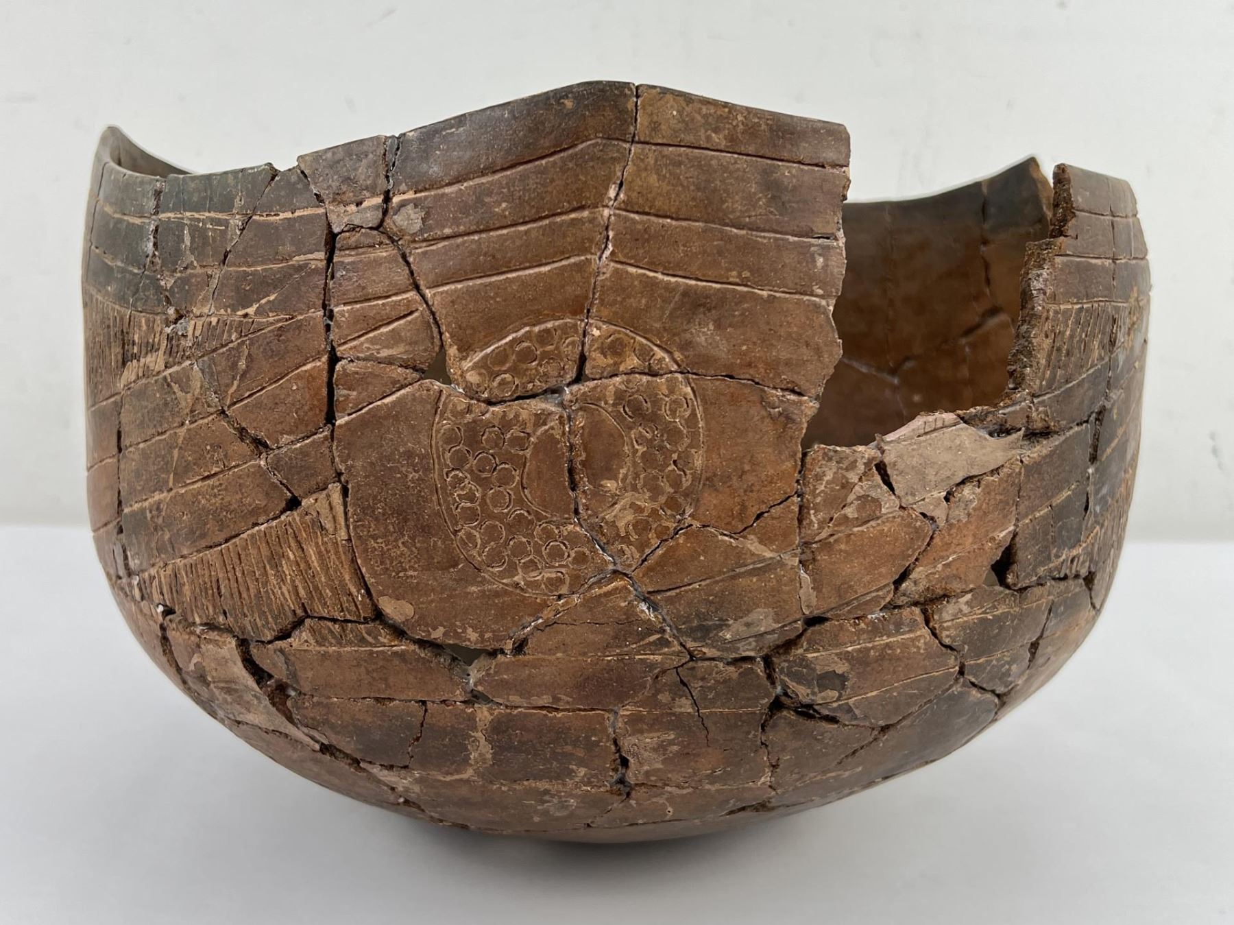 Huge and rare, incised Crenshaw Mound storage bowl with unique curvilinear and fine line motifs and four-point, scooped rim. Good condition, glued but unrestored, a few filled-in shards, with book photos. Measures approximately: 9" tall, and 13" in diameter. Ex: J.H. Durham collection Allard Auction Collection Inv: AX