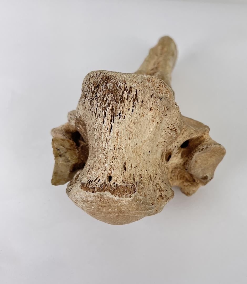 Gene Wensel Collection (Brothers of the Bow). Gene acquired this in the mid 1970. It was originally from a buffalo jump in Montana. Arrowhead is calcified into the bone. This was sent to an archeological society in Ohio. After testing was done on it, Gene received it back. It came from where the base of the neck joins the chest of an immature (teenage) bison. It was buried in gravel, not in dirt or sand. The arrowhead is stone. The buffalowas either shot while laying down or was shot at uphill. This item is Prehistoric. This item is from 3000-5000BC. It was not shot with a bow & arrow. It was shot with an atlatl.