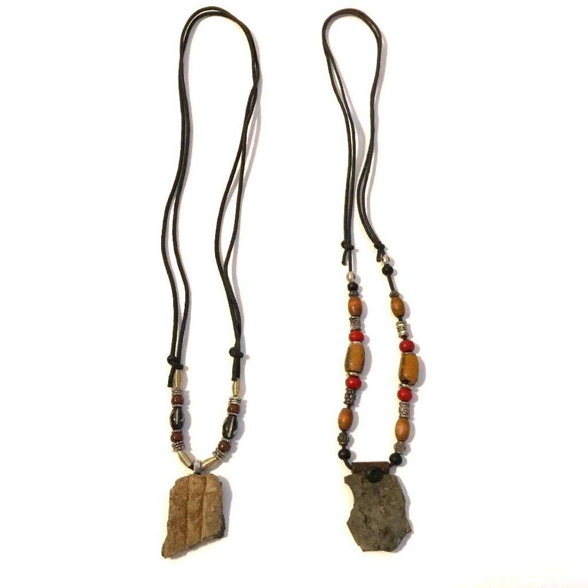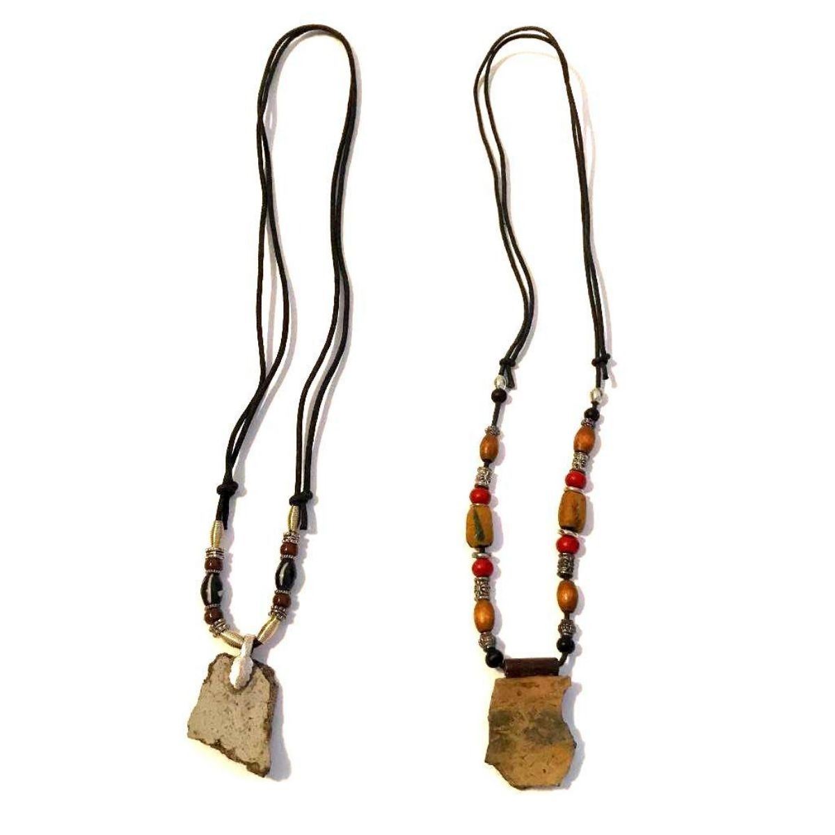 Pair of artisan necklaces, created using ancient Native American pottery shards & hand-made fired ceramic & silver beads, on leather adjustable length cords. Â