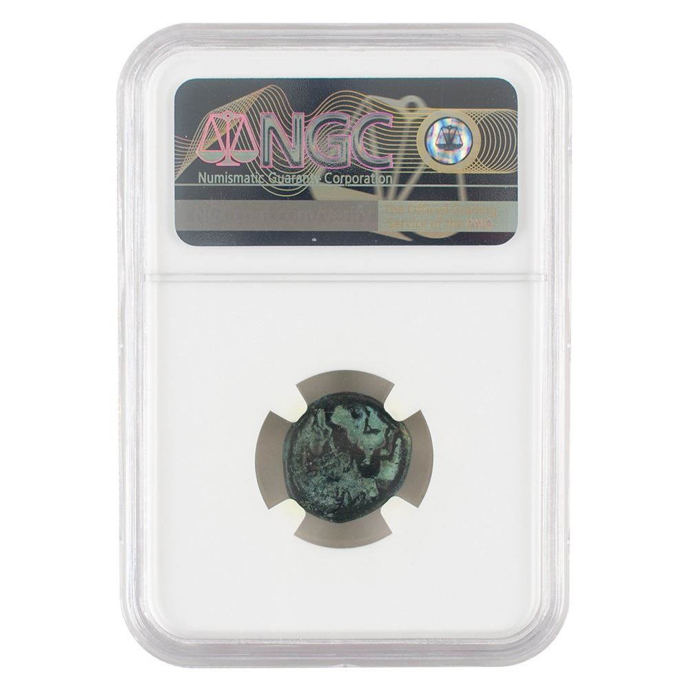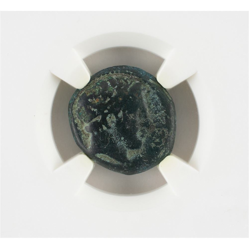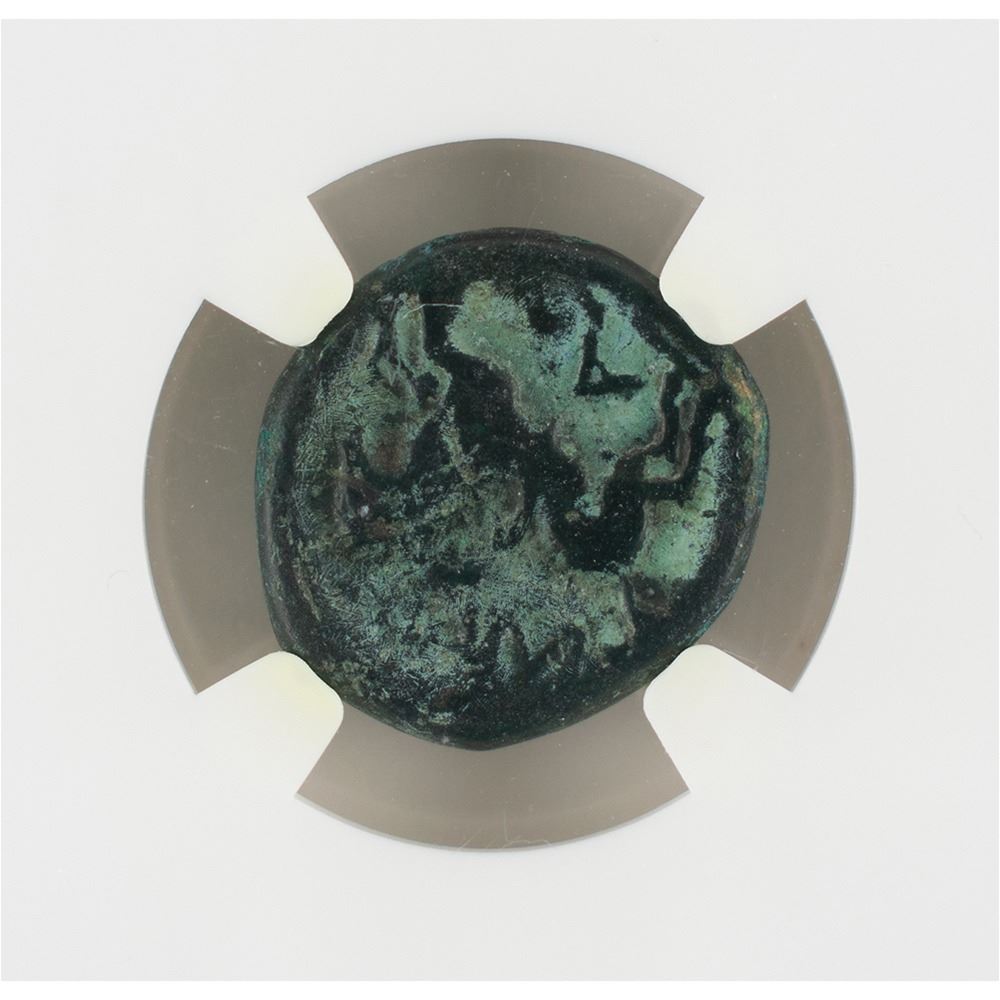Ancient Olympic Games bronze coin: Kingdom of Macedon, Philip II, ‘A’ Control Mark, 359-336 BC. 19 mm, 6 gm. The front shows a young male head, his hair bound with taenia, facing right; the reverse shows a youthful horseman advancing right, with an ‘A’ control mark beneath the horse. Encapsulated by NGC Ancients and graded ‘F’ with Strike 4/5 and Surface 3/5.
