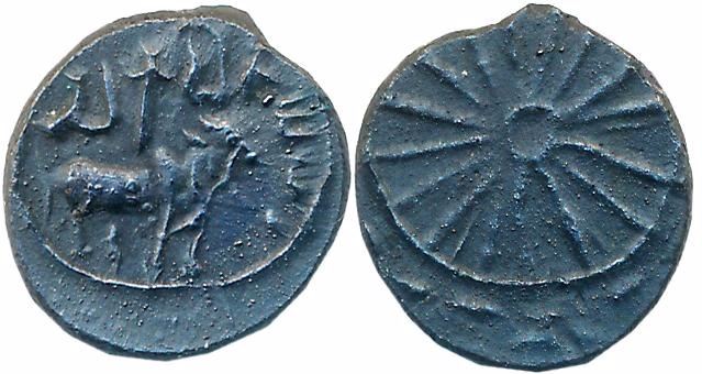 Pallavas of Kanchi, Potin, 1.37g, Obv: Bull standing to right, Brahmi legend above, Rev: Dharmachakra (wheel). Extremely fine, rare.