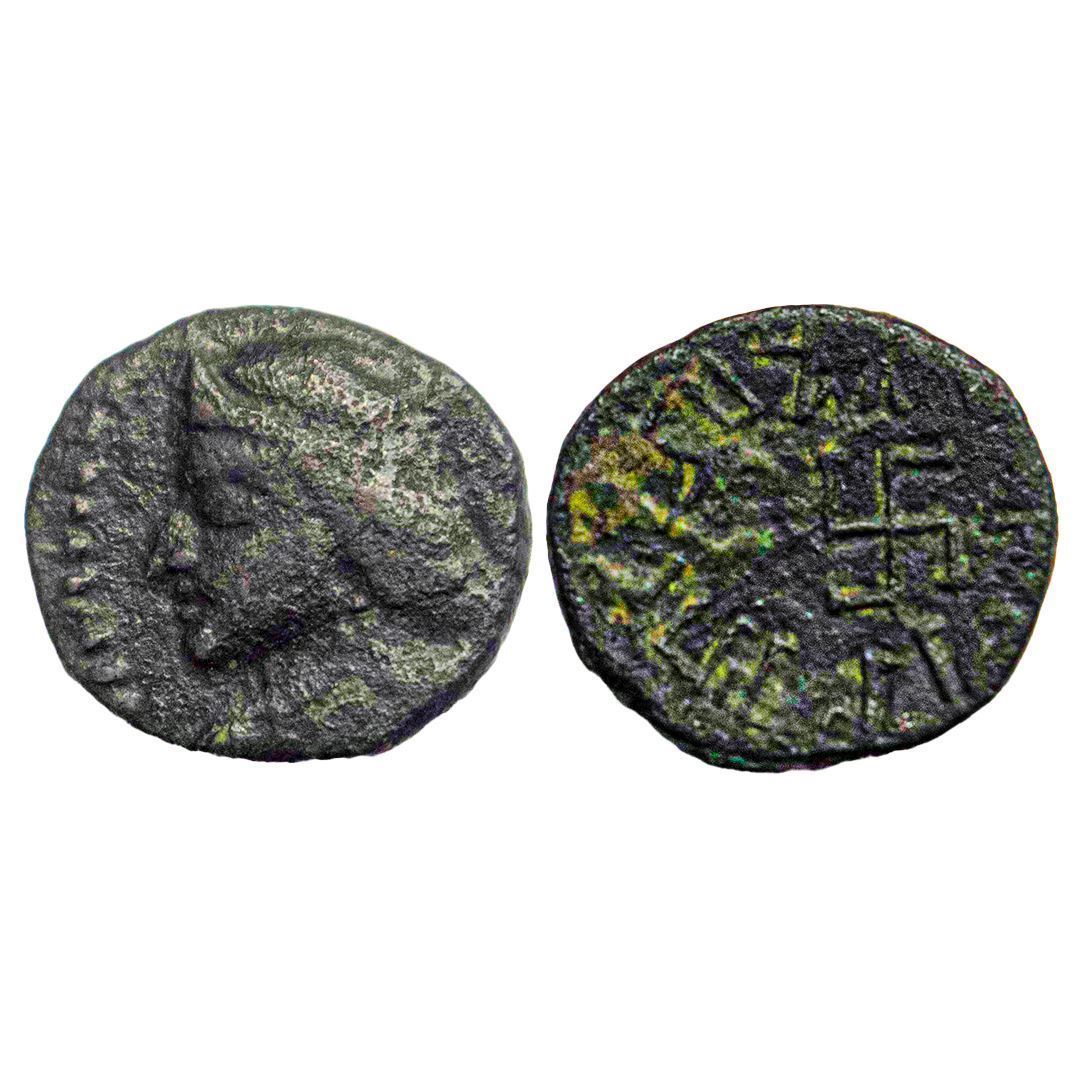 Ancient, Paratarajas, Koziya, (235-255) Copper Drachm, 1.99 gms, Obv. Draped and diademed bust of Koziya to left, Rev. & lsquo;KOZIYASA KOZANAPUTRASA PARATARAJASA& rsquo; in Kharoshti means of Koziya, son of Kozana, king of the Paratas around swastika, Pieper # 804. Tandon # 48, about very fine, very scarce.