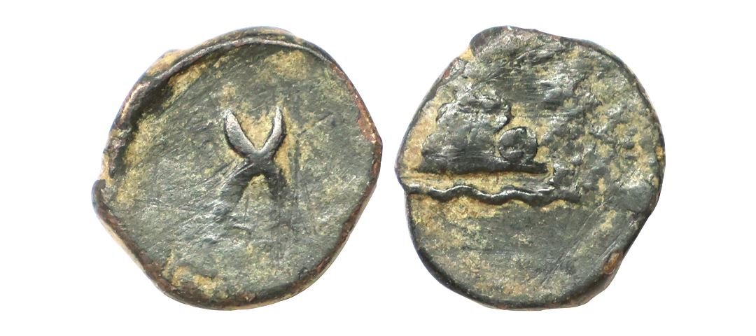 Ancient, Post-Mauryan, Anonymous Issue, Taxila type, Copper Unit, 3.30 gms, Three arched hill with crecent on top, Rev. six-arched hill & river below, fine, very scarce.
