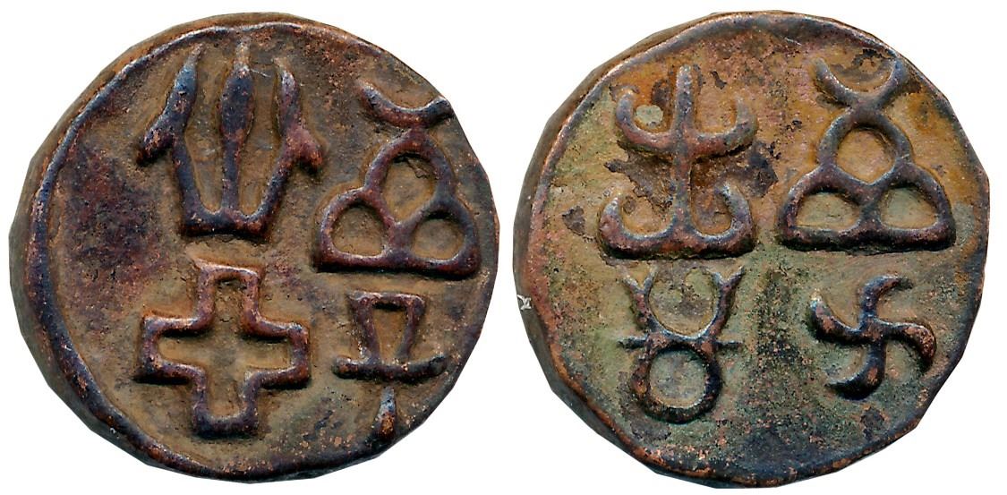 Post Mauryan, Local Taxila, Uninscribed die-struck Copper Heavy, 11.15g, “Biface series -Symbolic”, type, Obv: Symbolic configuration - clockwise from top left, a spear/standard with ribbons, three-arched Chaitya with crescent, triangle-headed standard, open cross, Rev: Symbolic configuration - clockwise from top left, Shrivatsa, three-arched Chaitya with crescent, Swastika, Nandipada (Similar to PAIC 1513 but of heavier weight). Deep bold strike, patinated, about uncirculated, extremely rare in this grade.
