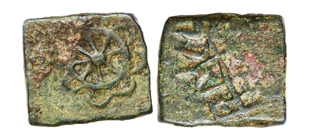 Ancient, Pre-Satavahana, (2nd – 1st Century BC), Copper Unit, 2.22 gms, Obv. Chakra, Rev. railed tree, Pieper #2362, very fine, scarce.