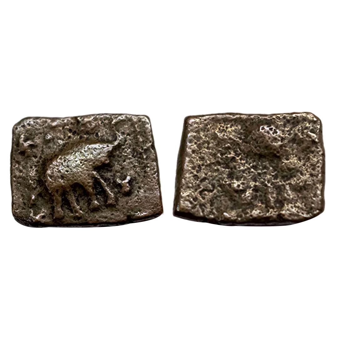 Ancient, Pre Satavahana, Copper Unit, Obv. Elephant, Rev. traces of tree in railing, 2.41g,