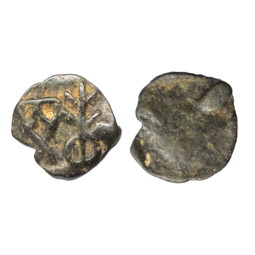 Ancient, Pre-Satavahanas, Uninscribed, Copper Unit, 0.93 gms, Obverse: Thre arched hill with a stylized human figure, Reverse: uniface, very fine, very scarce.