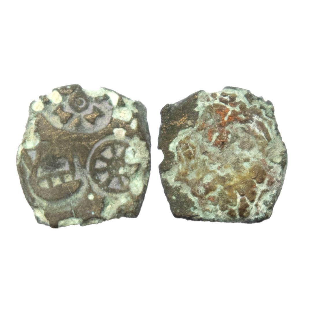 Ancient, Punch Marked Coinage, PMC from the lower Ganga delta region, usually attributed to Vanga Janapada, (3rd-2nd Century BC), Copper-Tin Alloy, 2.24 gms, Obv: Six Damru symbols surrounding two adjacent circles, Wheel and Boat, Gupta & Hardaker # Non-Imperial Series, BR20 pg. 259, very fine, very scarce.