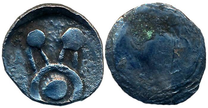Punch Marked, Attributed to Kuntala Janpada, Wai series, Silver 1 1/2 Shana, 1.48g, Uniface, "Pulley" type, Pulley symbol on obverse (Rajgor Series 31). Very fine+.