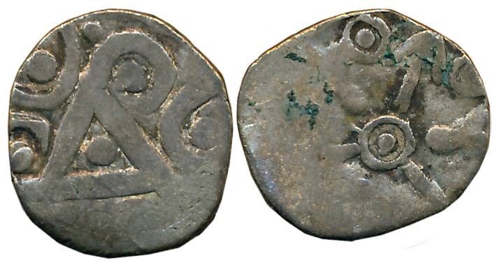 Punch Marked, Attributed to Kuru Janapada, Haryana Region, Silver 1/2 Karshapana, 1.38g, “Babyal Hoard” type, Obv: Triangular with dot, Rev: Six armed symbol (Rajgor Series 21). Very fine.