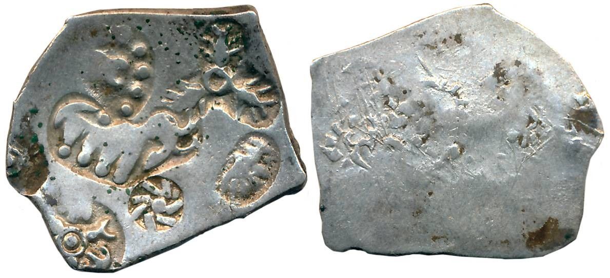 Punch Marked, Attributed to Magadha Janapada, Silver Karshapana, 3.39g, Uniface, G/H Series I, Five symbol type including radiant sun, six armed, elephant, three fish to attached with circle and other geometric symbol on obverse (Rajgor Series 12). Very fine+.