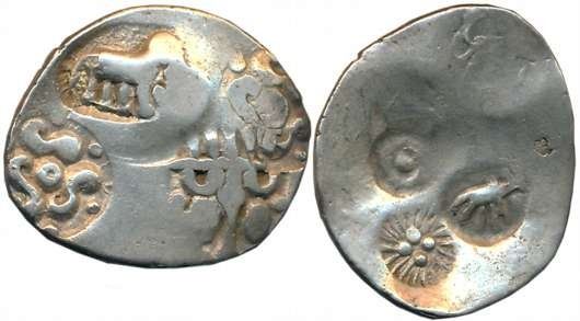 Punch Marked, Attributed to Kalinga Janapada, 3.51g, Obv: Four symbol type including Elephant, candelabra and geometric symbol twice, Rev: Banker marks. Very fine.
